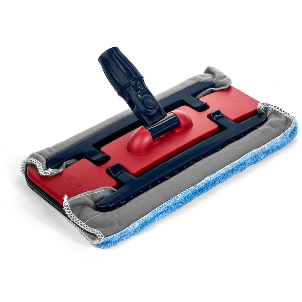 The Mop Head is 6 inches wide and 12 inches long. There are clamps on either side of the Mop Head to hold the microfiber cloth in place. The mop comes with 1 blue microfiber cloth. You can use these cloths damp or dry. We have found that the blue mop cloth should be used with the thicker side down for dry dust mopping and the shinier side down for damp mopping. This mop is not a replacement for a standard broom or a regular wet mop. The FlyLady Mop is to be used as a dry quick mop to grab up hair, lint, dust dirt and as a damp mop for a quick clean up and shine.